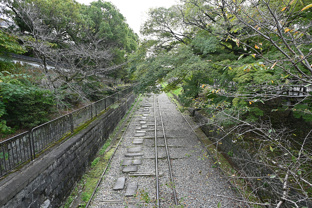 疏水による物資輸送は船を使って行われていましたが、蹴上周辺は急な傾斜があり、南禅寺船溜から標高の高い蹴上船溜へと物資を運ぶにはレールを敷いた坂道での運搬が必要でした。この斜面鉄道は船を載せた台車を傾斜に沿って運ぶ全長582メートルの設備でした。