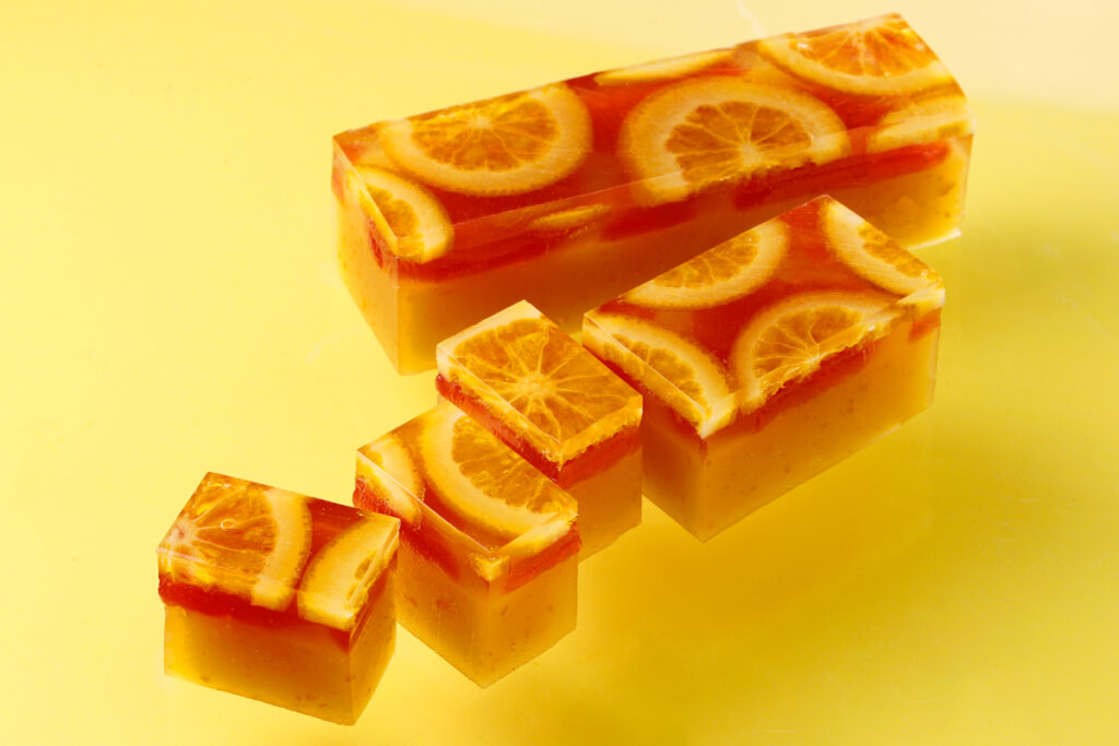涼しげな錦玉にとじ込めたオレンジの輪切りが華やかな橙々羹。アールグレイティのフレーバーである、ベルガモットの香り広がる錦玉の中には、パティシエが本場フランスで感銘を受けてレシピを開発した、濃厚で力強いブラッドオレンジを使用したパート・ド・フリュイを敷き詰めています。