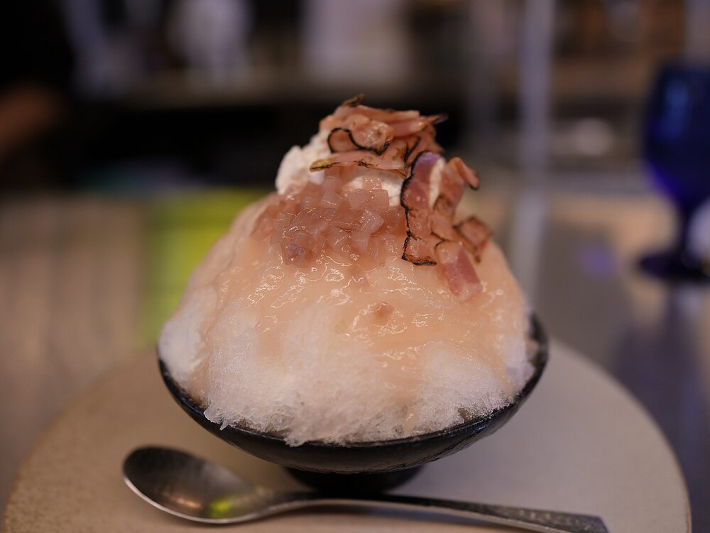 酒とこおり banks 甘じょっぱ香ばしい、衝撃のかき氷「桃モッツァレラ炙りベーコン」