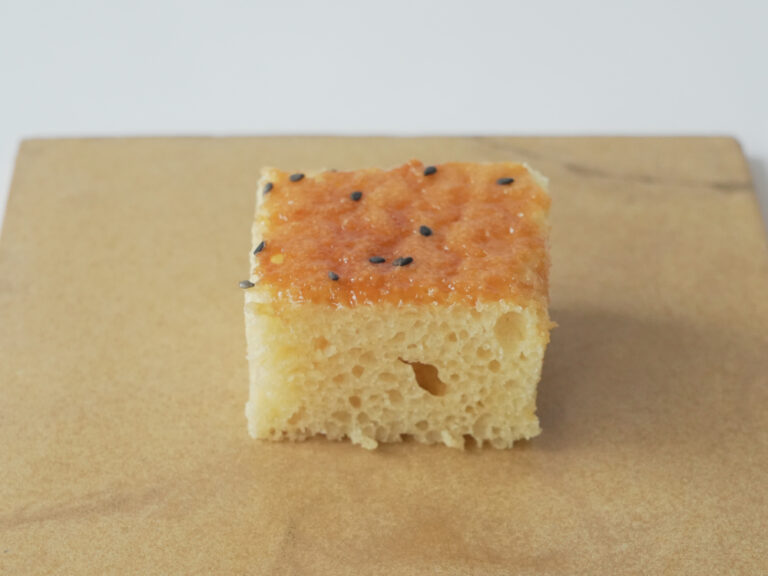 西京味噌(白味噌)、小麦粉、砂糖を主原料とし、表面に黒ごまをあしらって香ばしく焼き上げた和菓子です。卵やバターを一切使用しないため、しっとりとした質感でありながら、口に含むとどこかもっちりとした食感。カステラや蒸しパンにも似ていますが、より密度が高のが特徴です。見た目は素朴で、ひと口ごとに広がる味噌の香りと、ほんのりとした甘さが心地よく、この味わいのバランスこそが「味噌松風」の真骨頂。