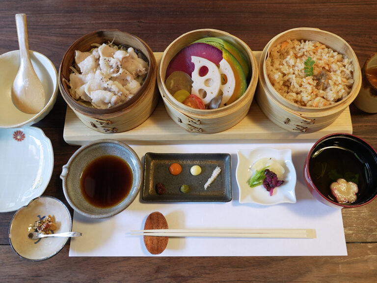 「季節野菜のせいろごはん」は、三段のせいろに盛り付けられたセットです。上段には旬の野菜、中央には京都のブランド豚「京都ぽーく」、下段には炊き込みごはんが入っています。