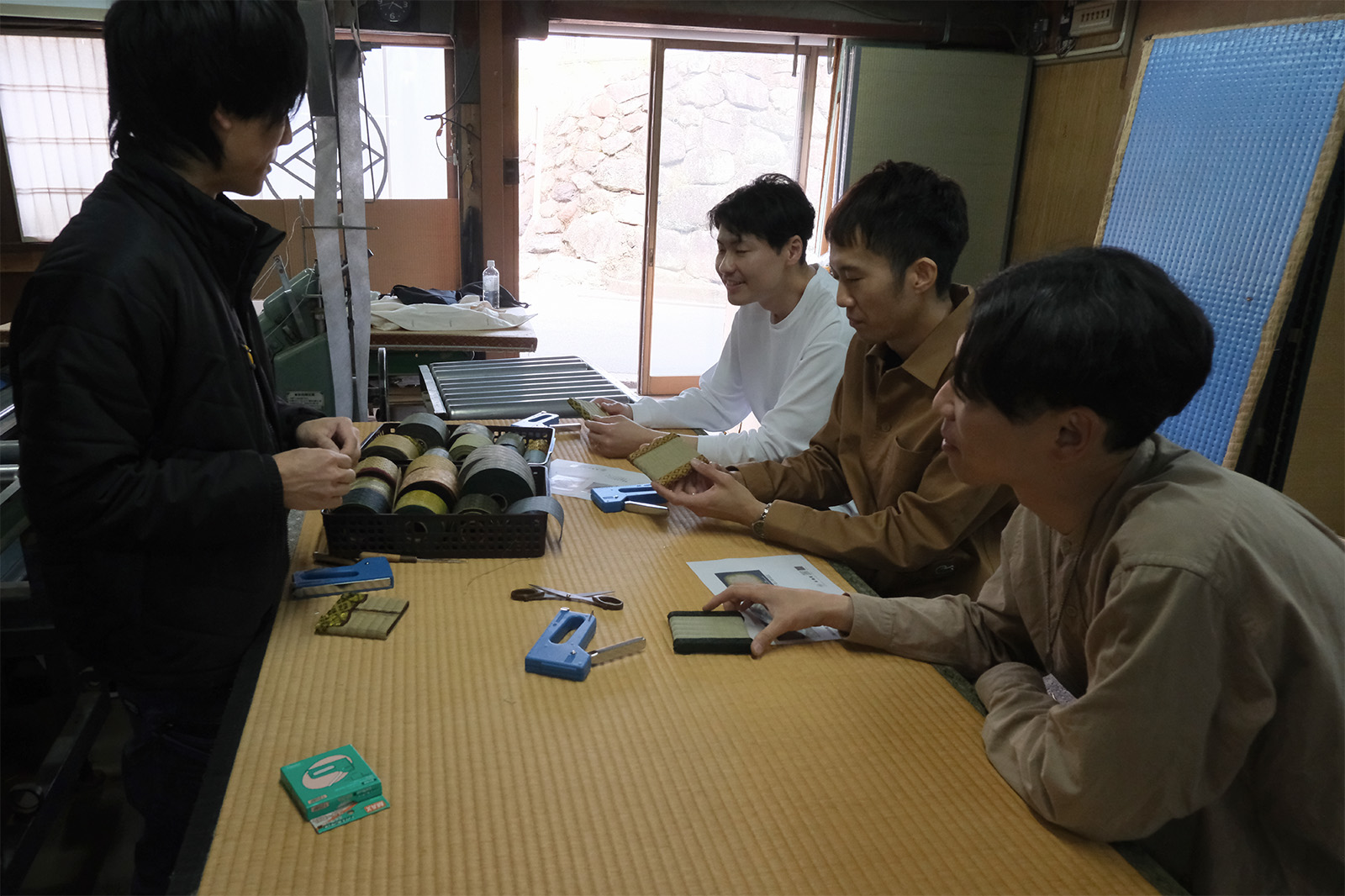ワークショップでは、座学だけでなく実際に手を動かしながら畳づくりの工程を体験できます。工房の見学に加え、畳包丁を使った作業や、縁を針と糸で縫う工程など、職人と同様の手順に挑みます。普段触れることのない道具を使い、自らの手で完成させる重みは格別です。最後には自分で仕上げたミニ畳を持ち帰ることができます。