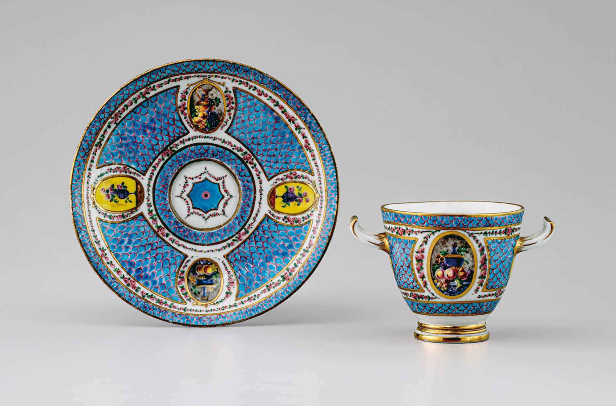 《青地色絵金彩花果文カップ&ソーサー》 1792年 町田市立博物館蔵(河原勝洋コレクション)