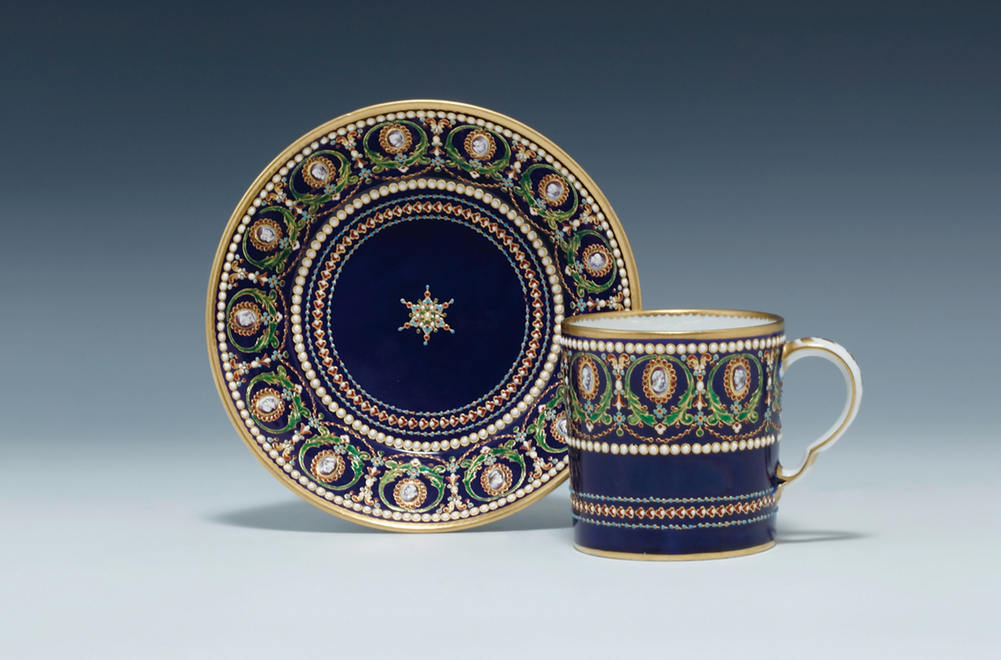 《藍地金彩七宝飾カメオ文カップ&ソーサー》 1784年 個人蔵