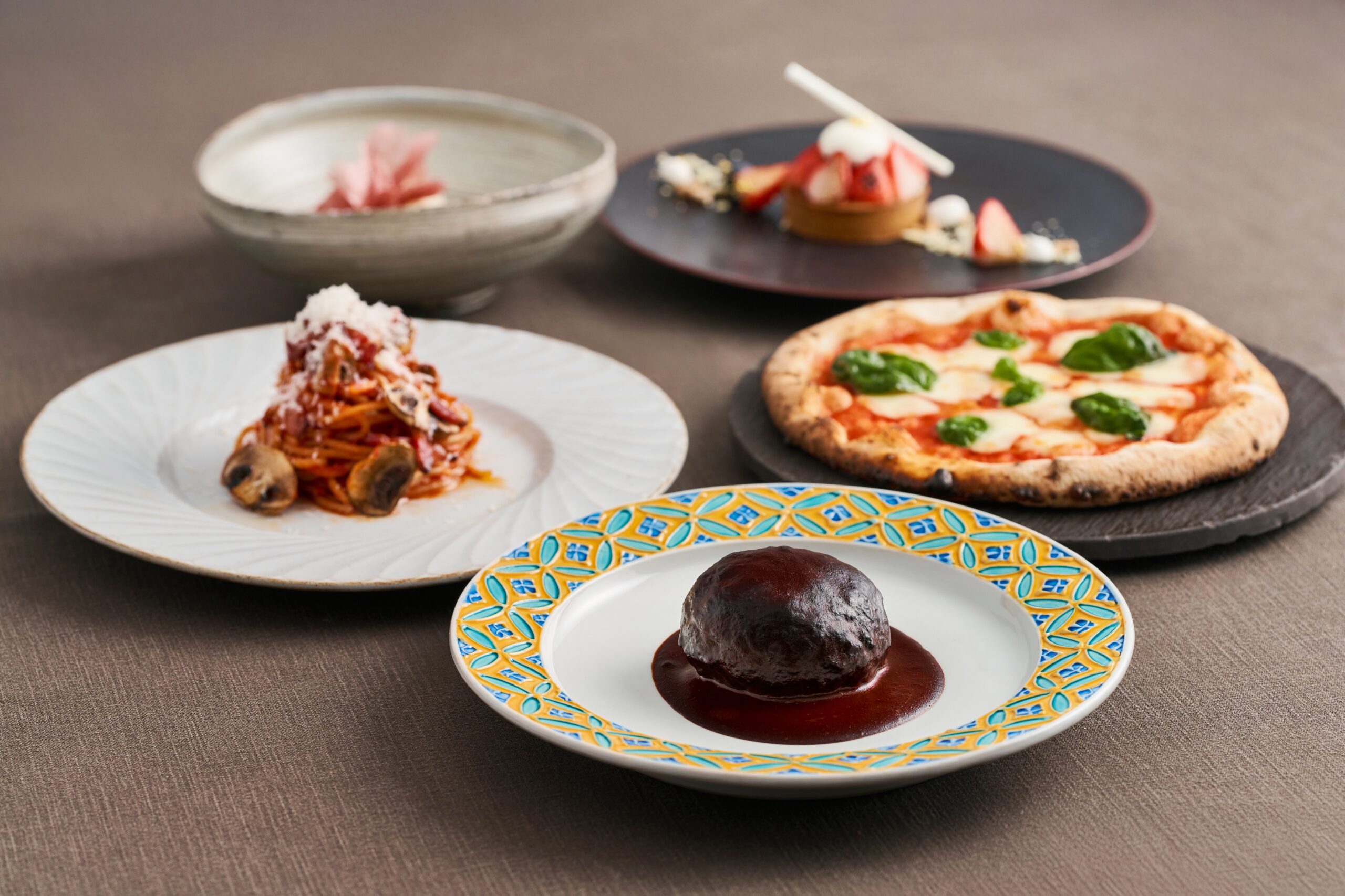 限定メニューの「DIALOGUE Special Lunch Set」は、前菜に続き、窯焼きハンバーグやピザ、パスタから選べるメイン、デザート2種が楽しめる特別ランチメニューが用意されています。ハンバーグの最終仕上げを薪窯で行う、ピザを注文後に焼き上げるなど、こちらも注文後の調理工程を大切にしています。デザートには、窯で火入れしたいちごのタルトや、白味噌をアクセントにしたパンナコッタが登場し、京都らしい食材の使い方にも注目です。