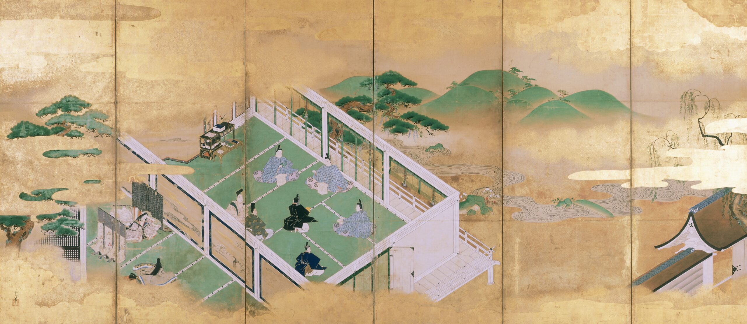 源氏物語図屏風 狩野常信筆(左隻) 六曲一双 紙本金地著色 江戸時代 相国寺蔵(Ⅰ期)
