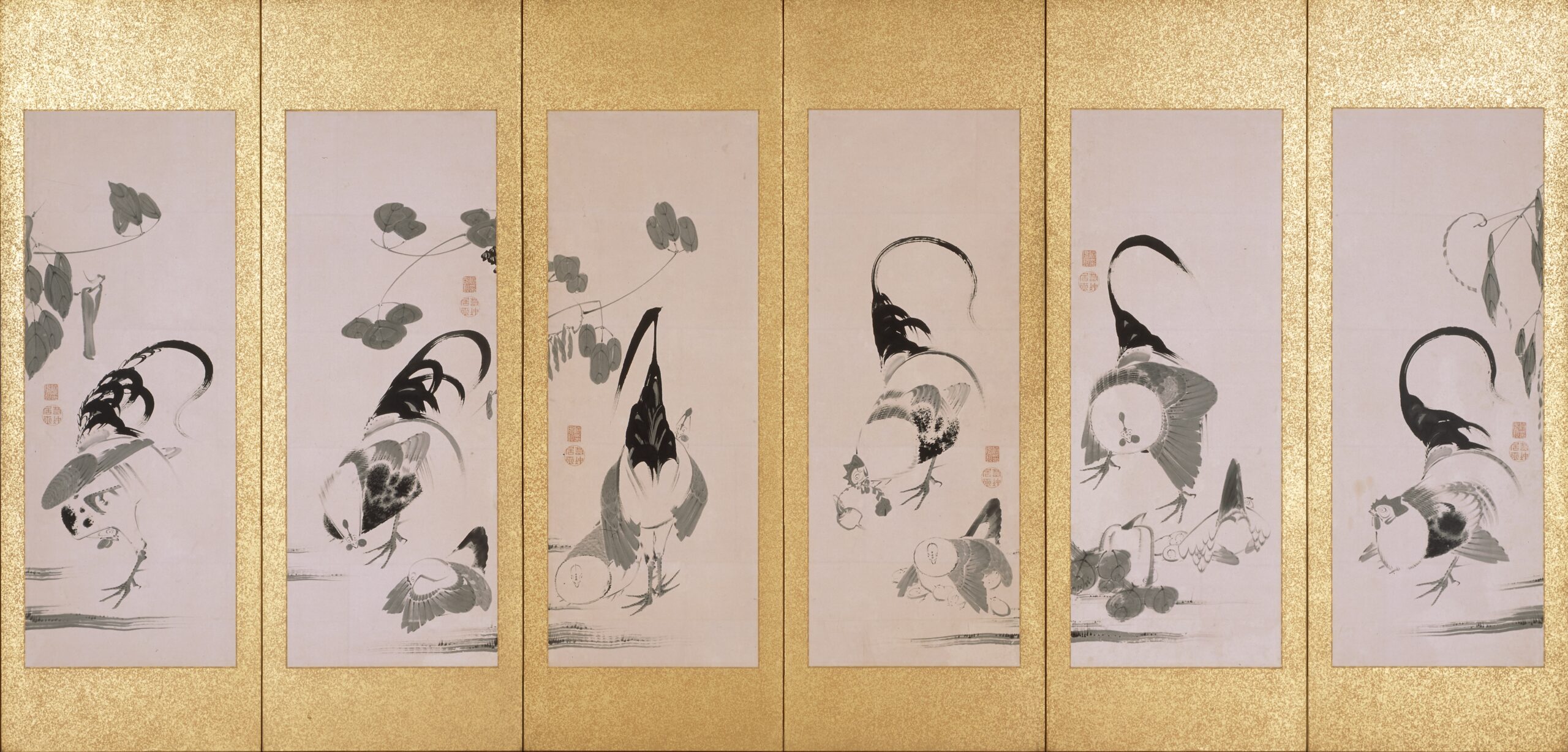 群鶏蔬菜図押絵貼屏風 伊藤若冲筆(右隻) 六曲一双 紙本墨画 江戸時代 相国寺蔵(Ⅱ期)