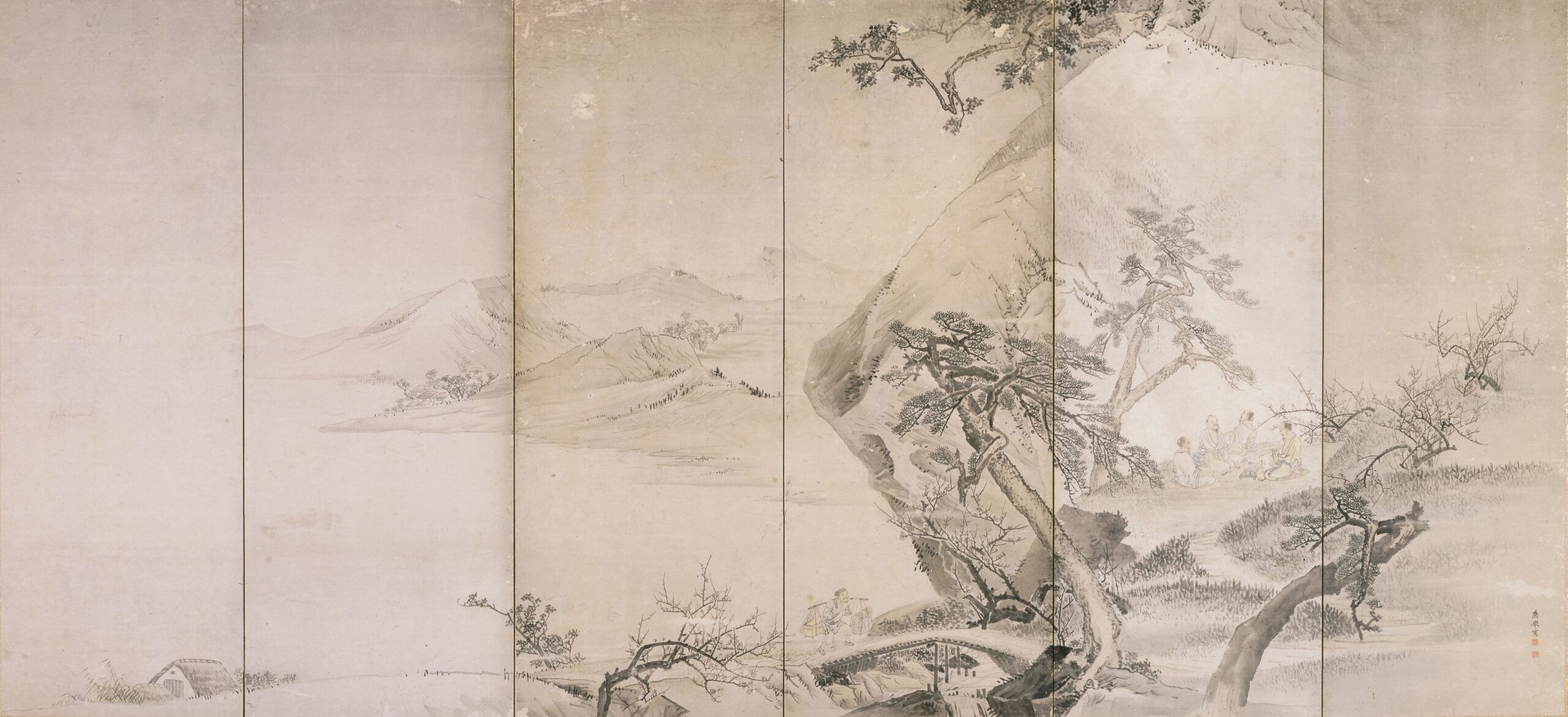 渓亭春興・秋山行楽図屏風 池大雅筆(右隻) 六曲一双 紙本淡彩 江戸時代 慈照寺蔵(Ⅰ期)