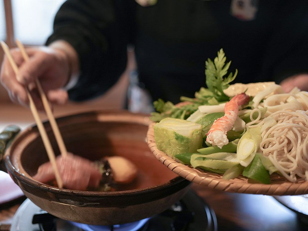 養老鍋の後半には、同じだしで蕎麦やきしめんをいただきます。具材の旨味が出ただしを使うため、締めの一杯まで楽しむことができます。蕎麦は喉ごしがよく、きしめんは平打ちで、だしとの絡みが良く、好みに応じて選ばれています。