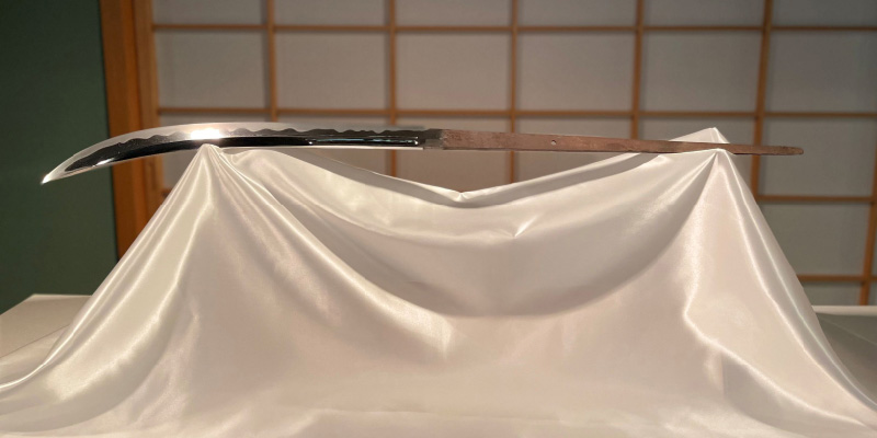 「静形薙刀」は鎌倉時代末期から南北朝時代に作られたとみられ、細身で反りが小さい形状が特徴です。刀身には磨き上げを重ねた痕跡が残り、矢傷とみられる跡から実戦で使われた可能性も感じられます。