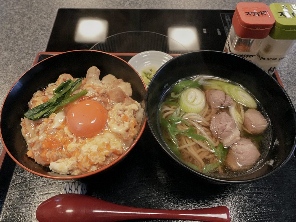 鴨の旨味とだしの風味が感じられる鴨なんばそばは、親子丼と組み合わせても無理なくいただける量です。京都らしい食材を取り入れた食事を求める方におすすめです。