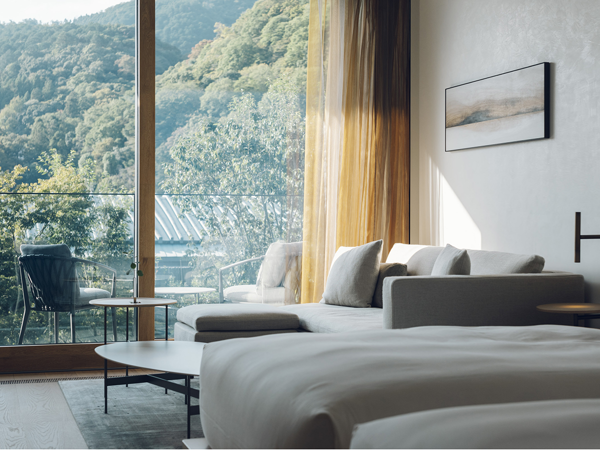 特注の大きな窓からは、嵐山や渡月橋、季節ごとに表情を変える庭園の景色を楽しめ、まるで一枚の絵の中にいるような感覚を味わえます。庭の見え方が一つではなく、場所によって少しずつ変わる点も、このホテルの特徴です。