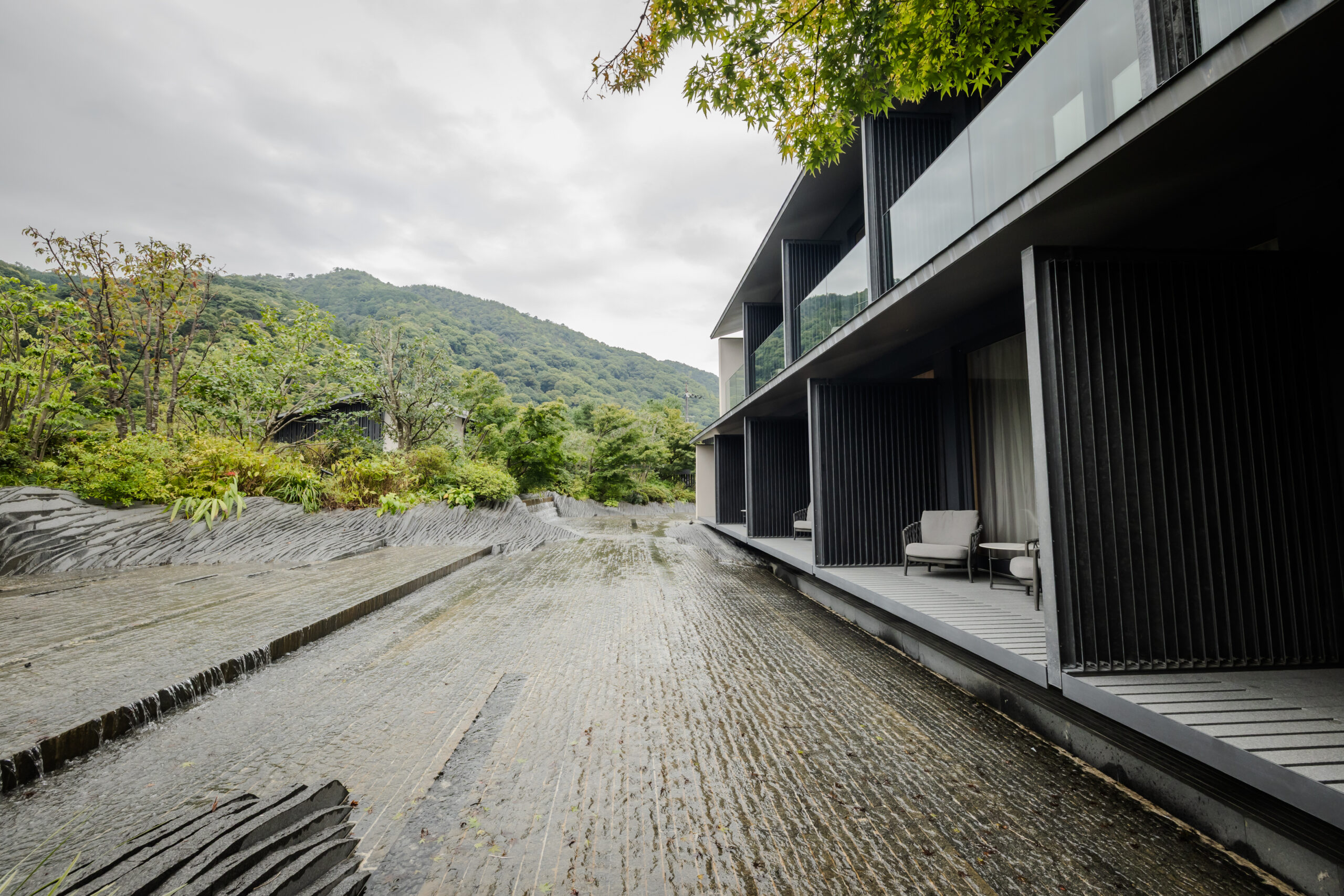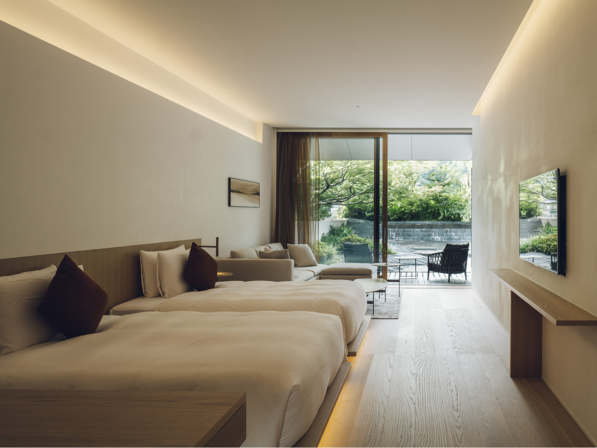 特に1階の客室から望む「黒の庭」は、流れる水の音を聞きながら滞在でき、宿泊客からは「バルコニーに座って贅沢な時間を過ごせた」という声が多く寄せられています。