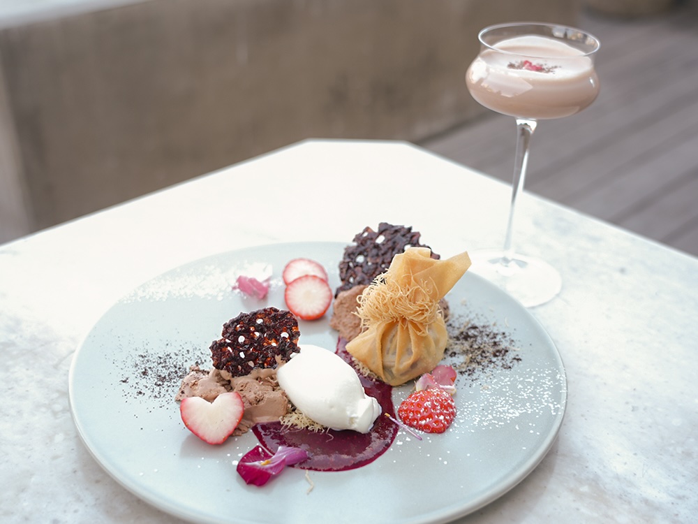 スペシャルデザートプレート 1,320円/オリジナルカクテル 「Sincere シンシア」 1,210円フェア期間中は、館内のレストラン「CICON」と「CICON Bakery」、ルーフトップバーにて、WHOSE CACAOのカカオを使用したオリジナルメニューが登場。