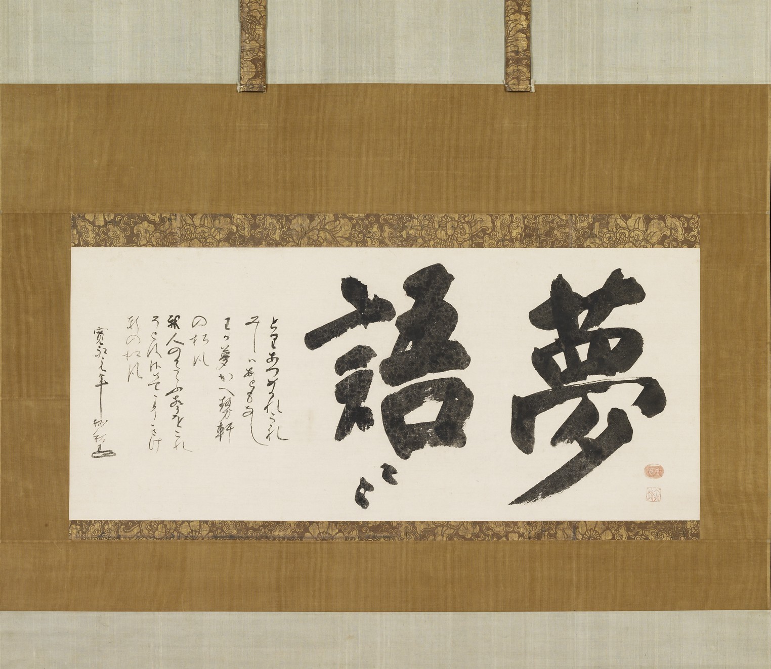 展示の中でも注目を集めるのが、「沢庵宗彭筆 夢語二字」。大正8年の入札で、得庵が亡き弟の追善茶会にぜひ使いたいと願った書でした。競り落としたのは住友春翠でしたが、事情を知った春翠は書を譲り、得庵は深く感謝の礼状を送ったと伝わります。金銭を超えた信義と友情が、二人の間に通っていたことを感じさせます。