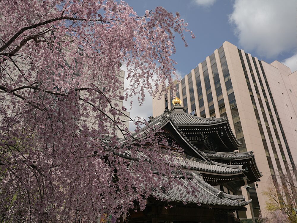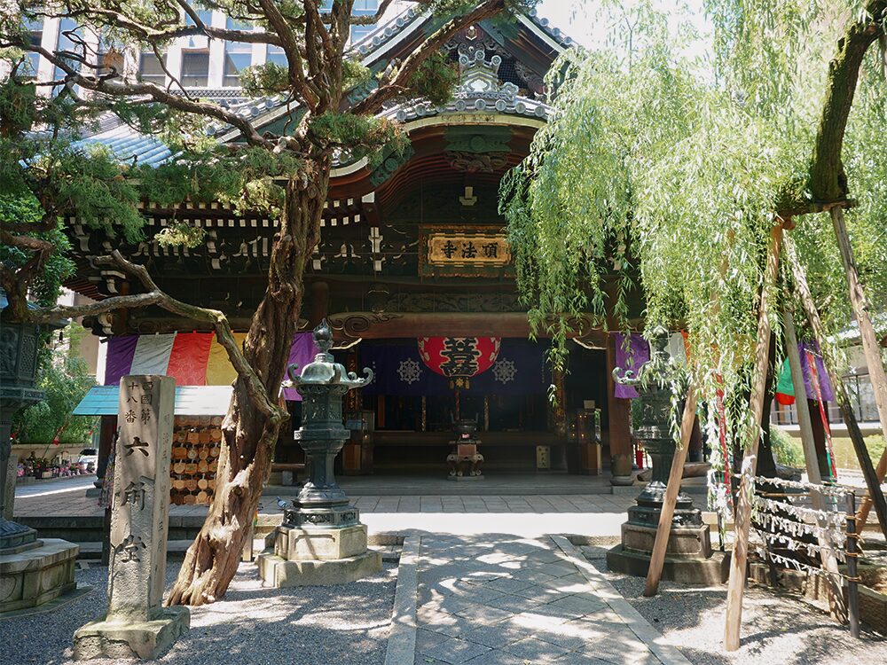 ビジネス街にありながら、地元の方々の信仰を集める生活に根ざしたお寺です。境内に集まる鳩も六角堂の名物です。