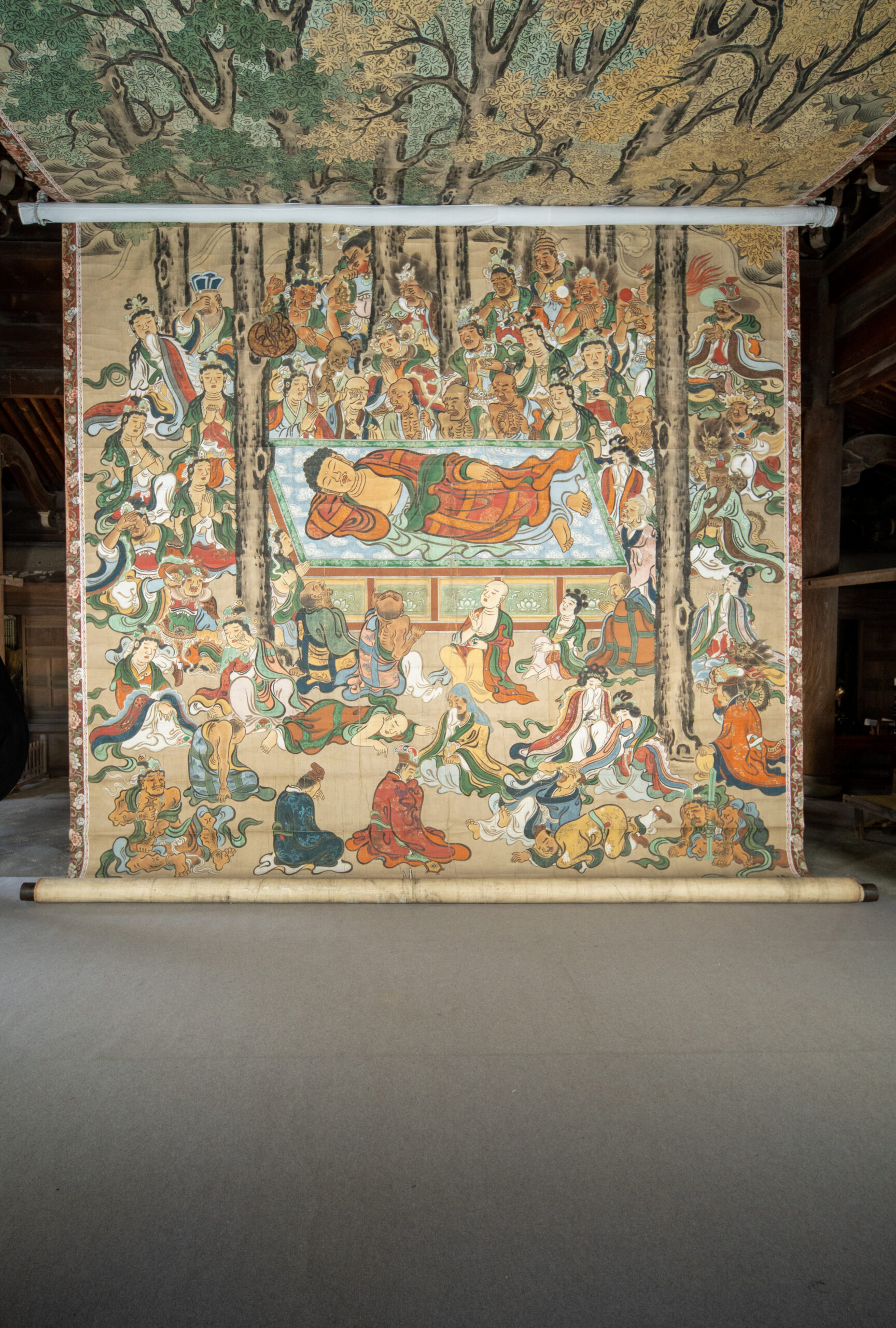 仏殿に入ると、まず中央に横たわるお釈迦様の姿が目に入ります。その周囲には多くの仏弟子たちが集まり、悲しむ様子が細かく描かれています。人物はほぼ等身大の大きさで表現されており、画面全体に広がる情景を間近で確認できます。