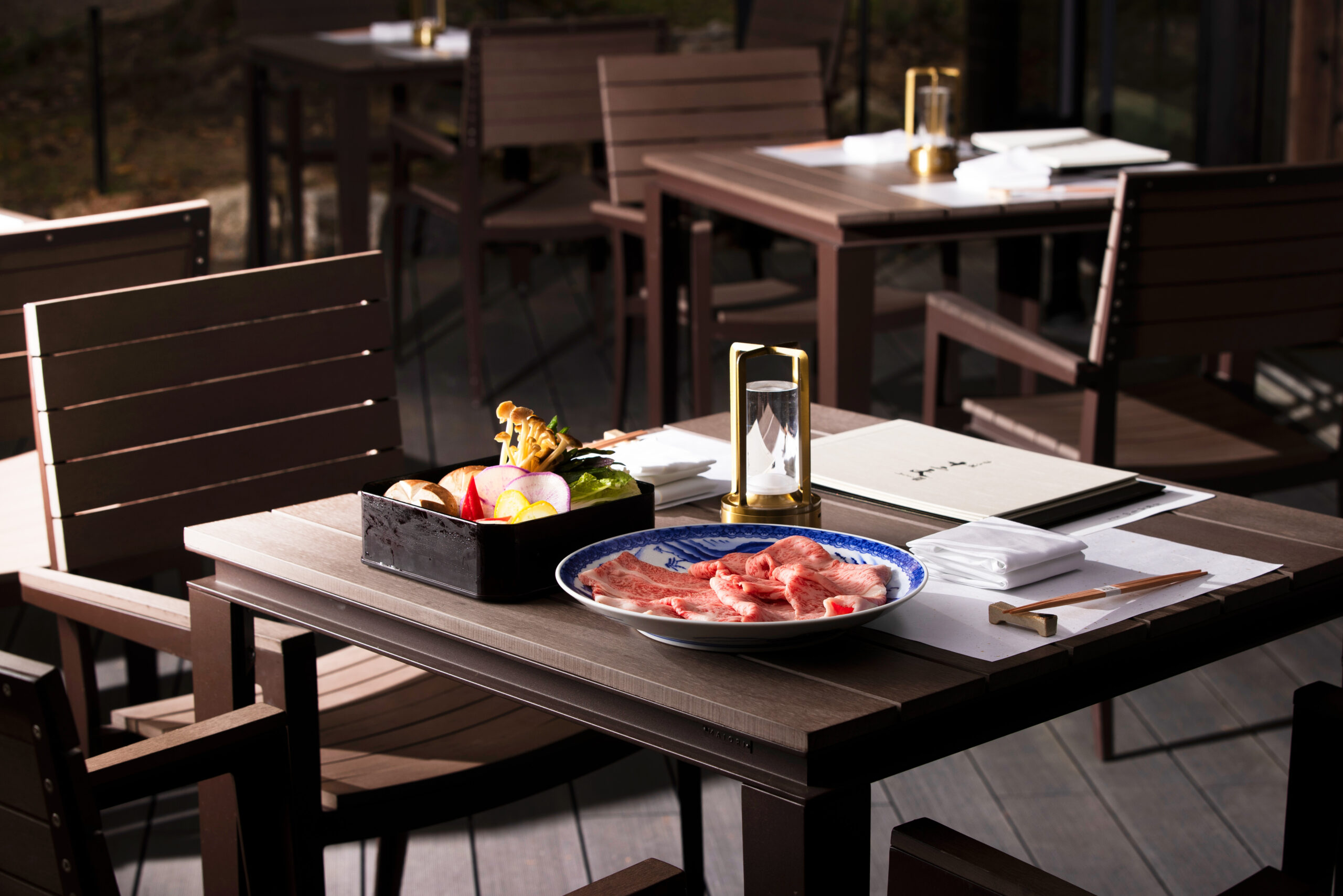 季節ごとに移ろう景色の美しさを間近に感じながらすき焼きを堪能いただけます。日中はやわらかな日差しの下、夕刻から夜にかけてはランプの灯りに照らされた京都らしい情緒とともに、店内での食事とはまたひと味違った格別の時間を過ごせます。
