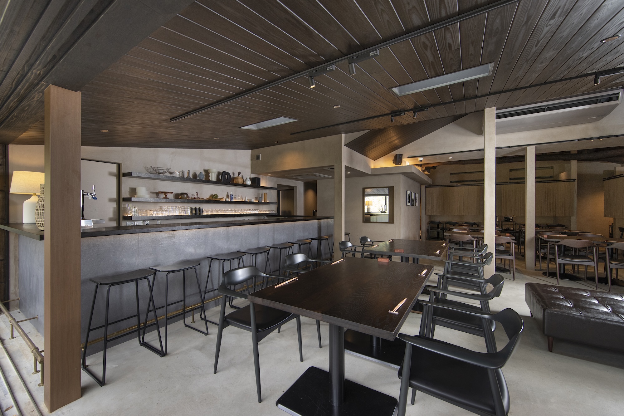 京町家を改装した京都らしい一軒家は、高い天井とオープンテラスを備え、心地よい開放感に満ちた空間が広がります。店内は、土や自然を思わせるアースカラーを基調に、円山公園の景観と調和するように作られています。和の要素を取り入れつつ、シンプルでモダンな家具を並べられており、肩肘張らずに食事を楽しめます。